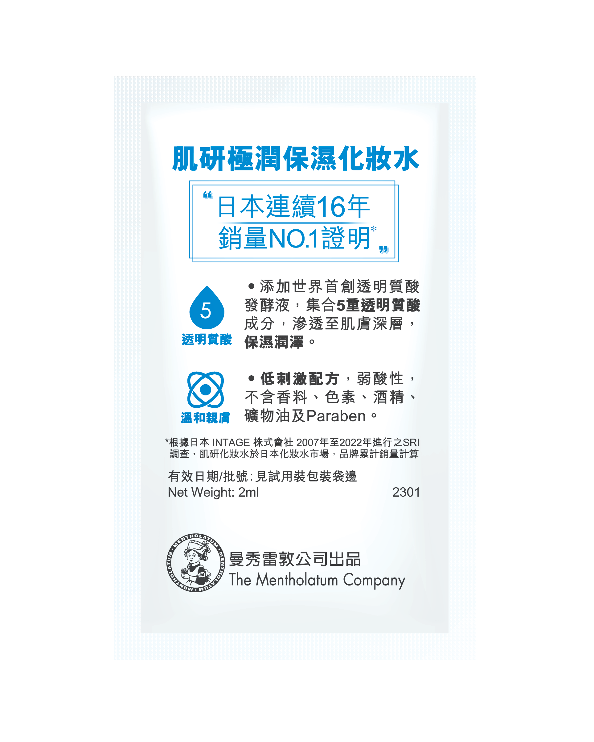 •升級配方添加世界首創透明質酸發酵液,集合5重透明質酸成分,肌膚即時柔滑;
